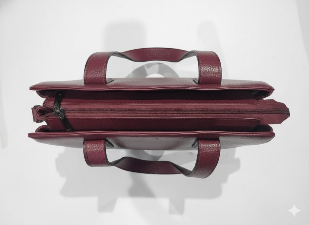 "quilted leather handbag, burgundy structured bag, executive purse, genuine leather tote, formal work bag"